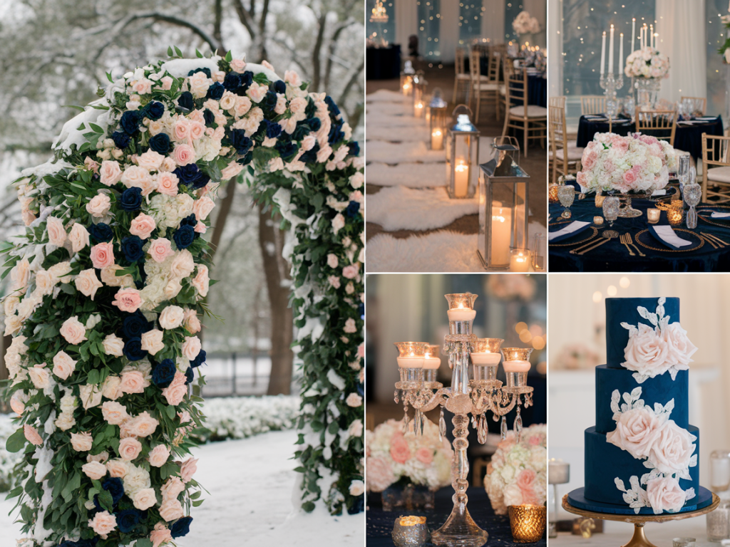 Step into a magical winter wedding set against the backdrop of snow-capped trees and a serene landscape, where navy blue and blush pink transform a cold winter’s day into a warm, romantic haven. This stunning setup captures the essence of elegance and winter wonder in one perfect package.