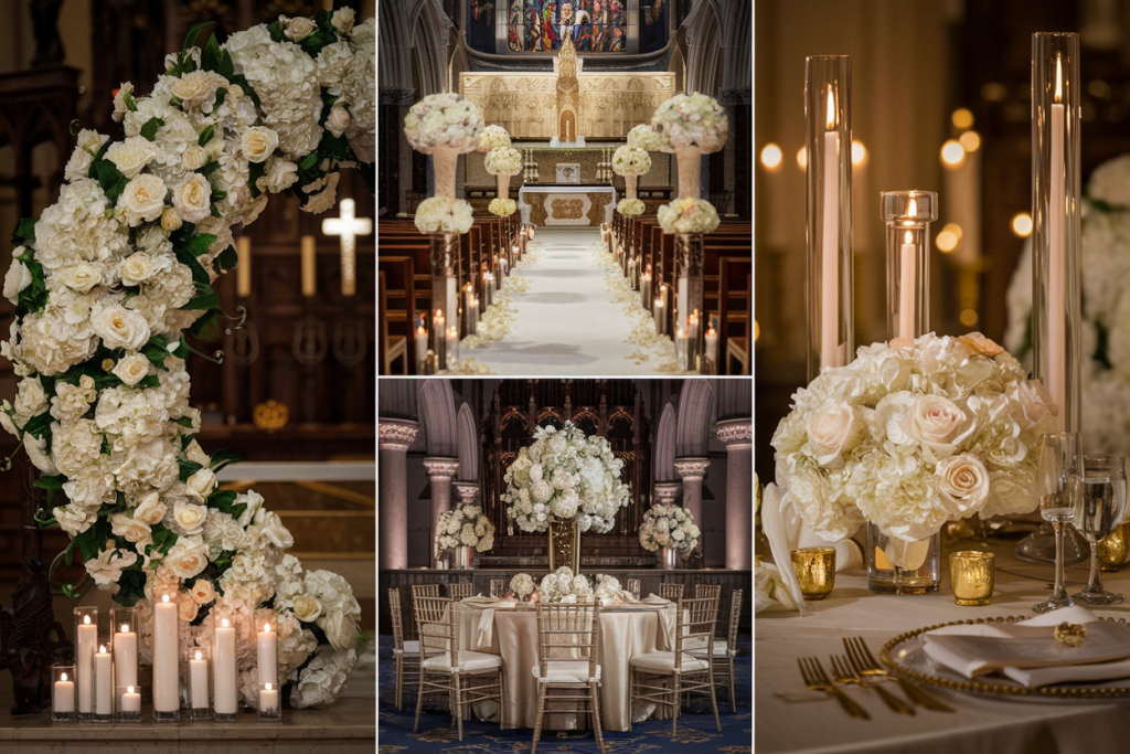 The aisle is lined with floral clusters and tall golden candelabras, adding a soft, romantic glow as guests make their way toward the altar. The candles, encased in glass holders, enhance the warm ambiance and provide a striking visual element, especially when combined with the pristine white floral arrangements that line the path. In the reception area, an array of candles against a dark backdrop creates a luxurious and intimate atmosphere.