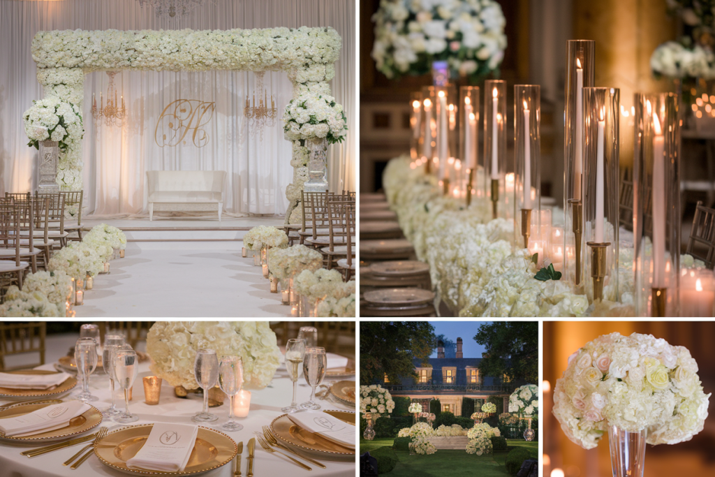 This magnificent wedding design embodies luxury and sophistication, set against the backdrop of a grand mansion. The combination of white florals, pearl accents, and gilded details creates a timeless atmosphere, exuding old-money elegance and refinement.