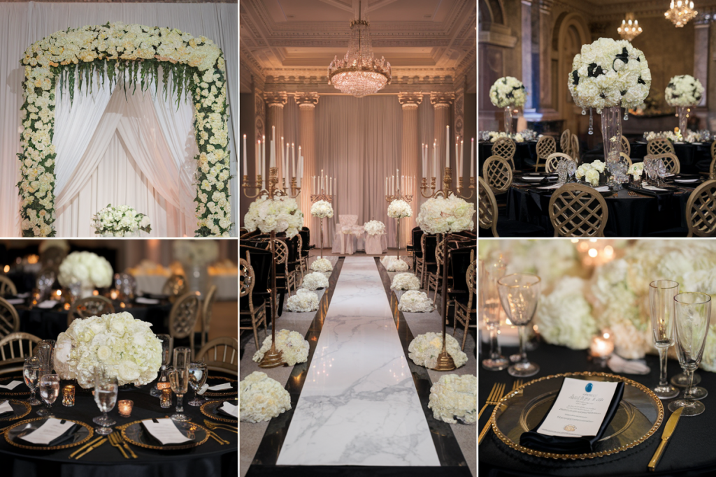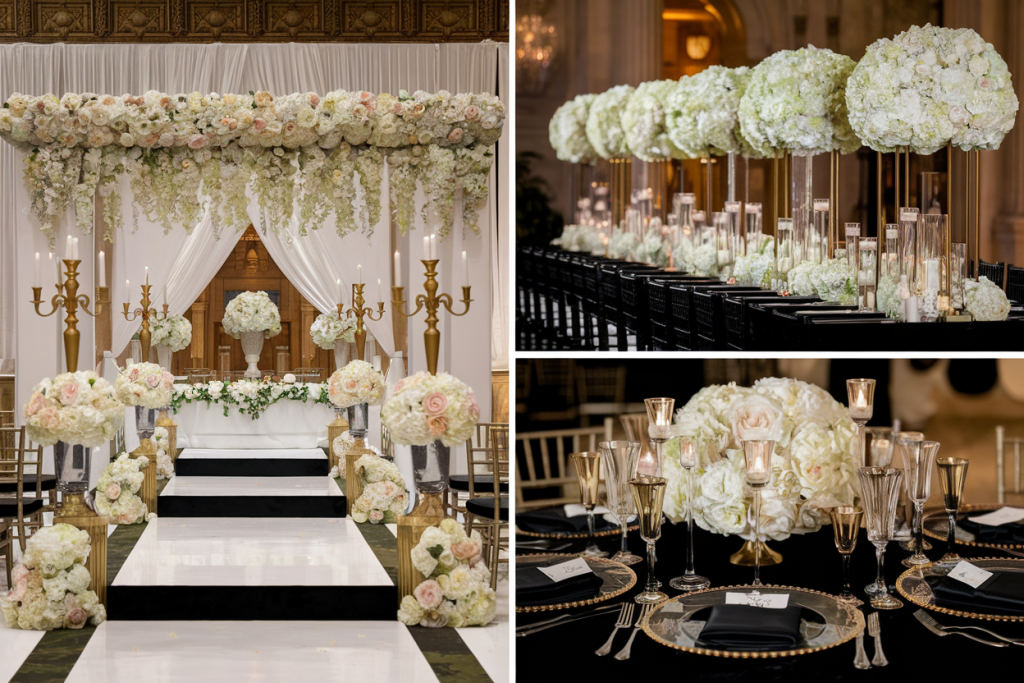 The design features a dramatic floral display above the altar—a lush cascade of white flowers, complemented by shimmering crystal accents, suspended gracefully from a delicate frame. These elegant blooms evoke a sense of serene opulence. Below, towering arrangements of white hydrangeas and roses in gilded vases adorn both the aisle and reception tables, adding depth and richness to the venue. The shiny black floor reflects the floral beauty, creating a mirror effect that magnifies the ethereal ambiance. Antique-inspired black chairs with gold detailing provide a luxurious seating arrangement, harmonizing perfectly with the venue’s classical architecture.