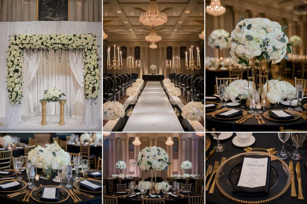 The reception tables are dressed in luxurious black tablecloths, creating a bold contrast against the white florals and gold accents. The dark linens allow the metallic gold elements to pop, and the gold-rimmed chargers and flatware enhance the upscale atmosphere of the venue.