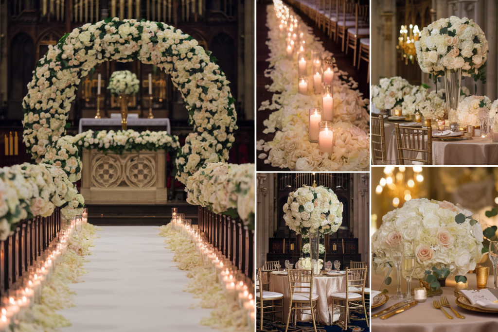 The dramatic floral arch, crafted from cascading white orchids and hydrangeas, creates a striking focal point at the altar, framing the couple as they exchange their vows. The aisle is lined with soft white petals, leading to the altar, while tall glass vases filled with more white blooms tower elegantly on either side. Soft candlelight illuminates the aisle, adding a warm, intimate glow to the luxurious setting. Reception tables, set with crisp white linens and surrounded by gold-rimmed chairs, are adorned with stunning floral centerpieces, complementing the purity of the ceremony. The grandeur of the space is enhanced by the opulent surroundings, making this a wedding of unparalleled elegance and class.