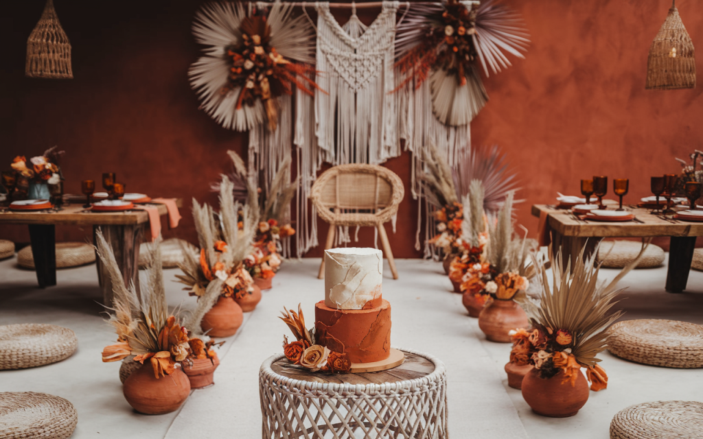 This bohemian-inspired wedding is a captivating celebration of earthy tones and natural textures, perfectly fitting its relaxed yet refined atmosphere. The deep, warm hues of orange and terracotta dominate the setting, while the intricate macramé backdrop adds a touch of vintage charm to the space. The wedding cake, elegantly designed with smooth terracotta accents and delicate white marbling, is a standout piece, drawing attention as a symbol of the union.