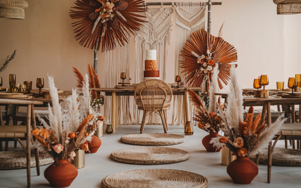 The ambiance is drenched in rich, sunbaked hues—burnt sienna, terracotta, and warm caramel—creating a space that feels both grounded and enchanting. Pampas grass plumes sway gently in ceramic vessels, their feathery textures complementing the intricate macramé backdrop that frames the sweetheart table. Every woven element, from the rattan chair to the circular jute aisle runners, whispers of effortless, organic beauty.
