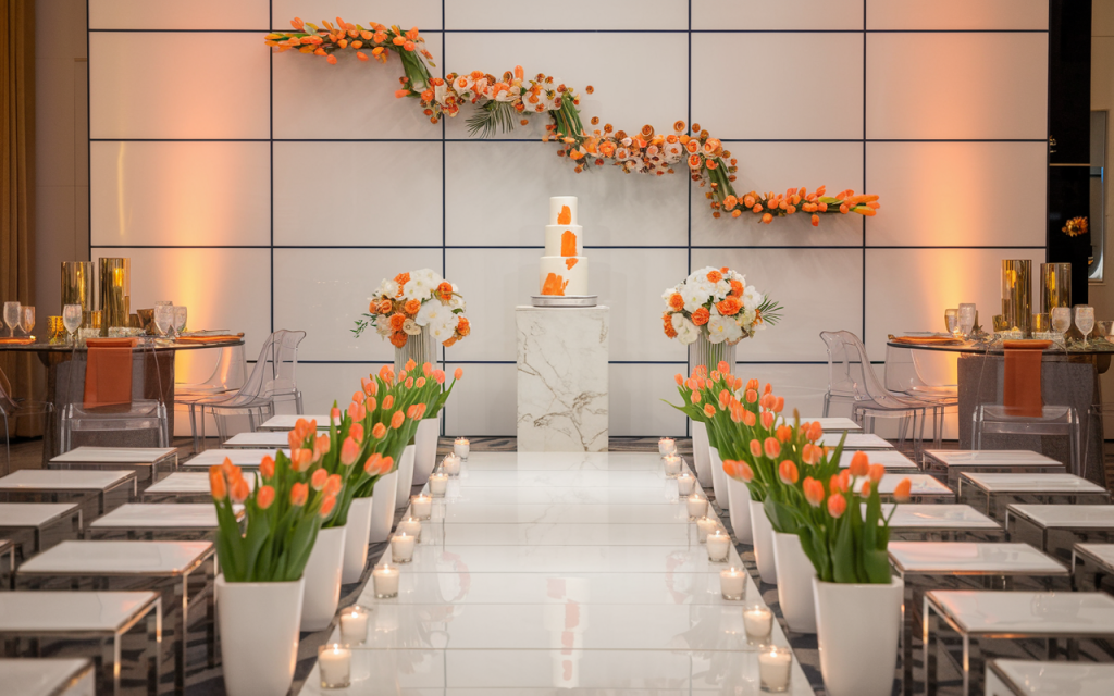 This wedding is a masterclass in contemporary elegance—where structured minimalism meets vibrant, confident design. A sleek, high-gloss aisle, lined with potted orange tulips, leads the eye toward a strikingly modern altar. Floating candles flicker softly, reflecting off the pristine white floor, while golden light washes over the space, adding a touch of warmth to the crisp geometric lines.