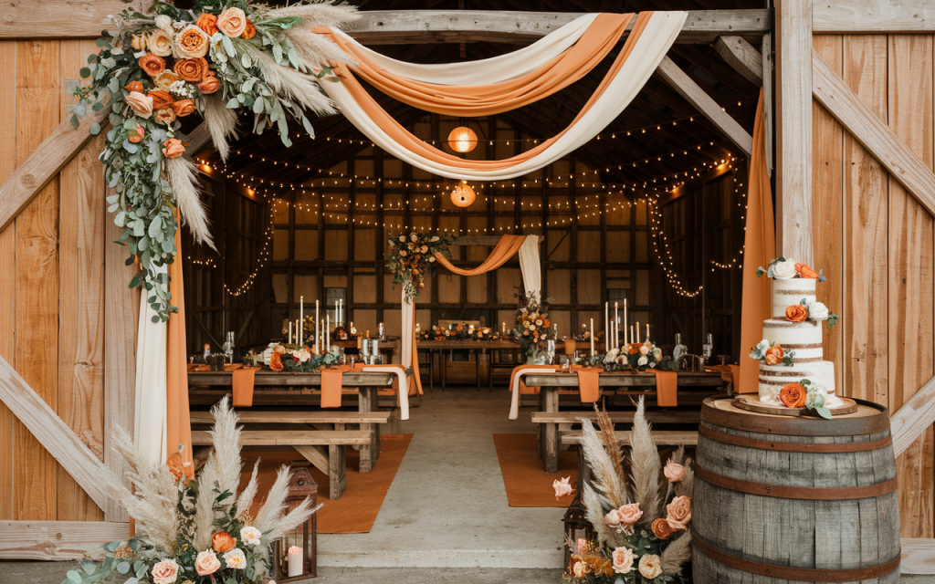 Step into a cozy, rustic barn that has been transformed into a whimsical wedding venue filled with warmth and charm. The entrance, framed by a stunning archway draped in soft orange and cream fabric, leads you into a space illuminated by the soft glow of string lights hanging from the wooden beams above. Fresh flowers, in shades of orange and cream, adorn the arch and table arrangements, creating a welcoming and intimate atmosphere.