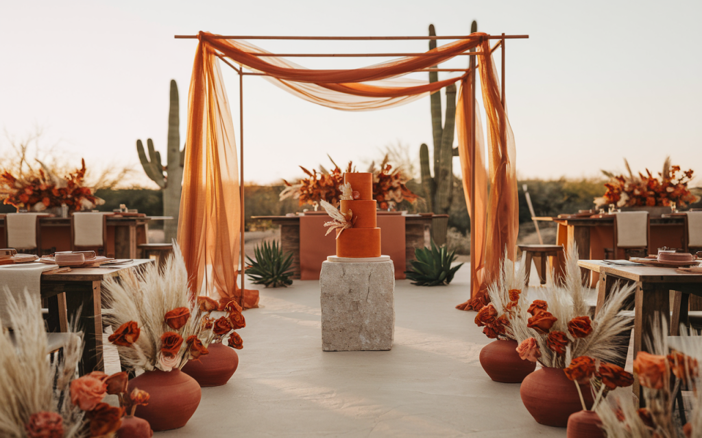 Bathed in the golden glow of the setting sun, this desert-inspired wedding radiates raw, untamed beauty. A sleek, minimalist altar, draped in sheer terracotta fabric, sways gently in the warm breeze, framing a landscape of towering cacti and endless desert horizon. The burnt-orange color palette, paired with natural textures, creates an aesthetic that is both earthy and effortlessly elegant.