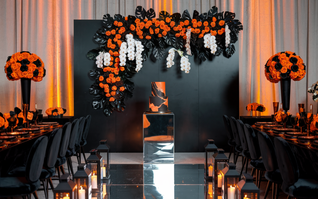 This bold and modern wedding setting is a masterclass in high-contrast sophistication. The interplay of deep black, fiery orange, and crisp white creates an atmosphere of intrigue and opulence, perfect for couples who dare to redefine tradition. The backdrop—a sleek black panel adorned with cascading orchids and a burst of orange roses—frames the dramatic centerpiece: a sculptural cake with marbled black and ember tones.