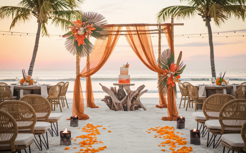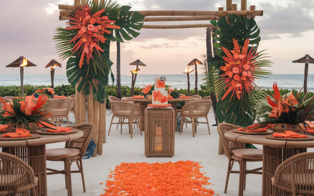 This tropical wedding setting is a celebration of vibrant colors, with the fiery hues of orange taking center stage. The ceremony area is beautifully framed by a bamboo arch adorned with lush, exotic flowers, including stunning tropical blooms and greenery. The bright orange rose petals leading the way to the altar create a captivating contrast against the soft sand of the beach, while tiki torches cast a warm glow as the sunset paints the sky in the background.