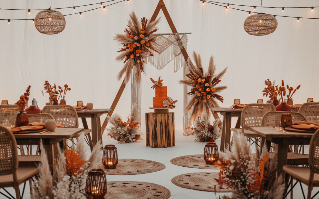 This boho-inspired wedding exudes a sense of dreamy warmth, with hues of burnt orange, terracotta, and golden yellows creating a welcoming atmosphere. The ceremony space is beautifully framed by a wooden arch draped in pampas grass and vibrant marigold flowers, all accentuated by rustic textures like woven baskets and earthy candles. The cake, a striking orange creation adorned with floral accents, rests gracefully on a wooden stump, becoming a centerpiece that ties together the vibrant palette.