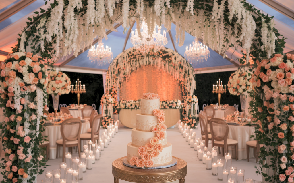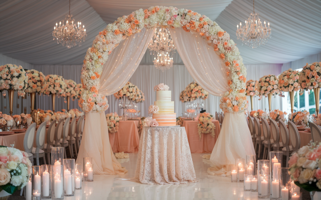 Step into a world of elegance and warmth with a pastel wedding setup that embodies romance and sophistication. The scene is set within a grand, draped white marquee, with chandeliers gently illuminating the space. A floral arch, adorned with soft peach, blush, and cream roses, frames the altar, where a delicately designed wedding cake rests, embellished with more cascading flowers.