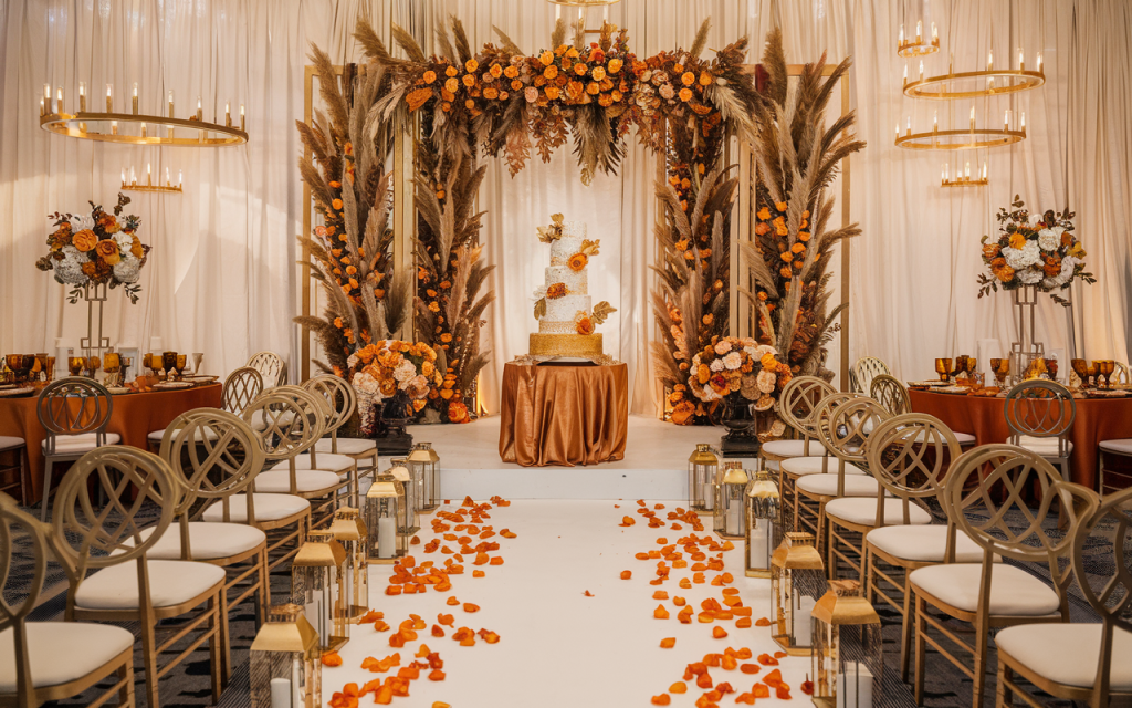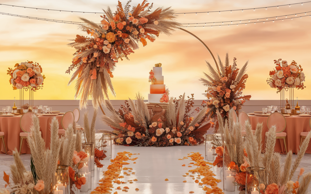 This stunning wedding setup is bathed in the warm hues of a sunset-inspired color scheme, where vibrant oranges and soft peaches create a magical atmosphere. The scene is framed by magnificent floral arches filled with roses, pampas grass, and other vibrant blooms, all cascading in a harmonious arrangement. The aisle, lined with scattered rose petals, leads to a beautifully adorned wedding cake that perfectly matches the rich tones of the flowers surrounding it.