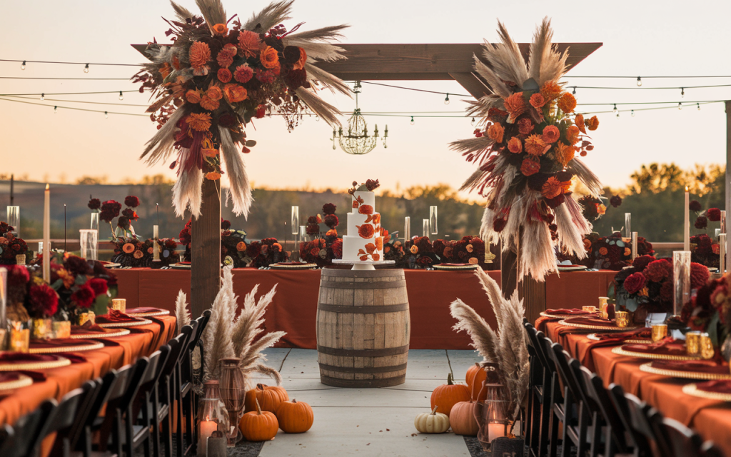 Golden light spills across the horizon as this autumn-inspired wedding embraces the richness of the season. A wooden archway, adorned with cascading burnt-orange roses, deep crimson blooms, and feathery pampas grass, frames the scene, exuding a rustic yet sophisticated charm. Beneath the open sky, the warm, earthy palette sets a tone of cozy elegance, with flickering lanterns and scattered pumpkins lending a harvest festival ambiance.