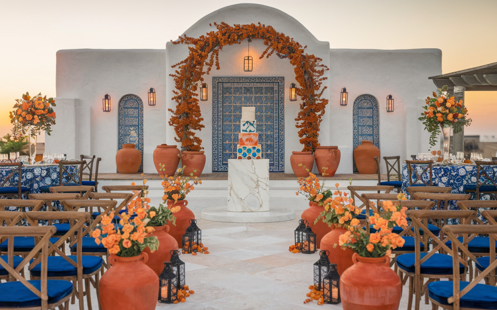 As the golden sun sets over the horizon, a striking Mediterranean wedding emerges. The scene is set in a serene, whitewashed venue, where the vibrant hues of orange, blue, and terracotta paint a picture of warmth and joy. The ceremony takes place under an arch made of cascading orange blossoms, which frame the couple’s moment beneath a beautifully tiled backdrop.