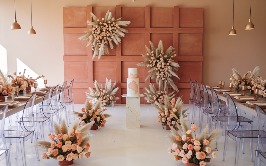 This modern minimalist wedding setting exudes sophistication and warmth. The warm terracotta backdrop adds an earthy yet contemporary touch, while the soft, peach-toned flowers and pampas grass create a delicate and natural atmosphere. The cake, a vision in white with a subtle watercolor effect, stands elegantly on a marble pedestal, serving as the focal point of the venue.