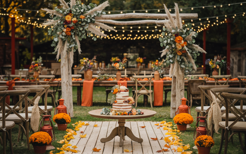rustic outdoor wedding scene perfectly captures the essence of autumn with its warm color palette and natural decor. The ceremony space is framed by a beautiful wooden arch adorned with vibrant florals in shades of orange, yellow, and deep red. The aisle is lined with lanterns and marigold pots, enhancing the cozy and inviting atmosphere. A scattering of yellow leaves adds a touch of whimsy to the scene, leading the eye towards the charming three-tier cake, decorated with fresh fruits and flowers.