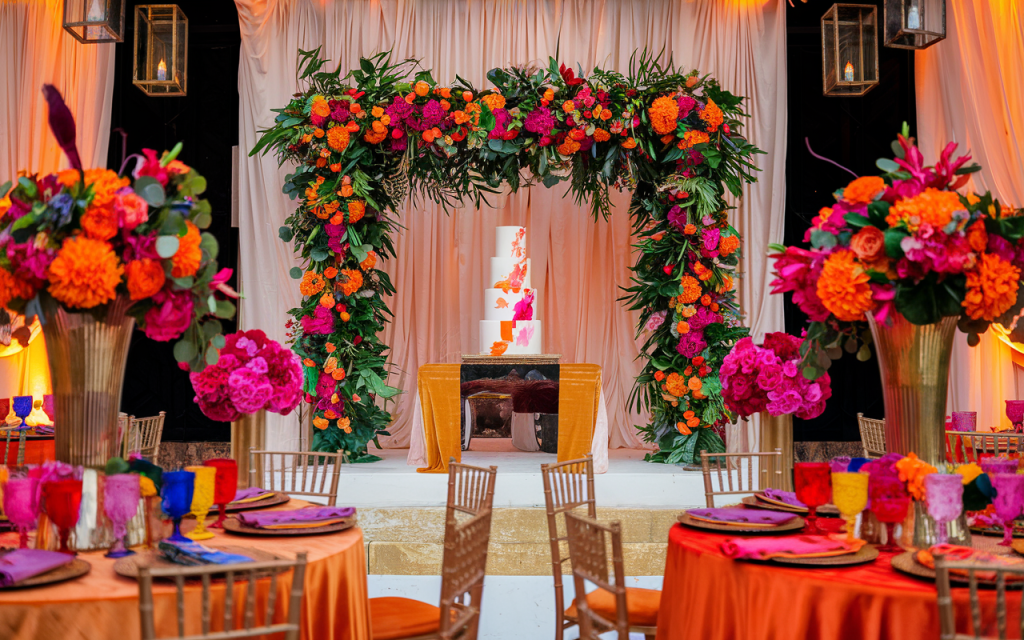 A striking blend of tropical flora surrounds the venue, where towering arrangements of marigolds and orchids frame the wedding cake—a masterpiece adorned with bold splashes of pink and orange. The towering floral arches draw the eye toward the altar, while string lights gently illuminate the scene, adding a touch of sparkle to the romantic ambiance. Tables set with colorful glassware, vibrant napkins, and gold accents invite guests to indulge in a celebration that feels both intimate and grand.