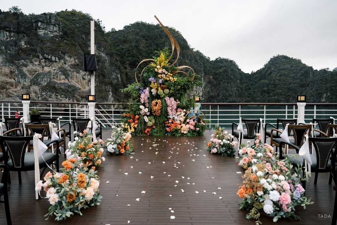If I could bottle up a dream, it might look like this vibrant ceremony floating above the emerald waters of Ha Long Bay. Ambassador Cruise Halong brought the drama with a soaring floral installation — a cascade of fiery orange, sunset pink, and lush green that felt alive against the misty cliffs beyond.