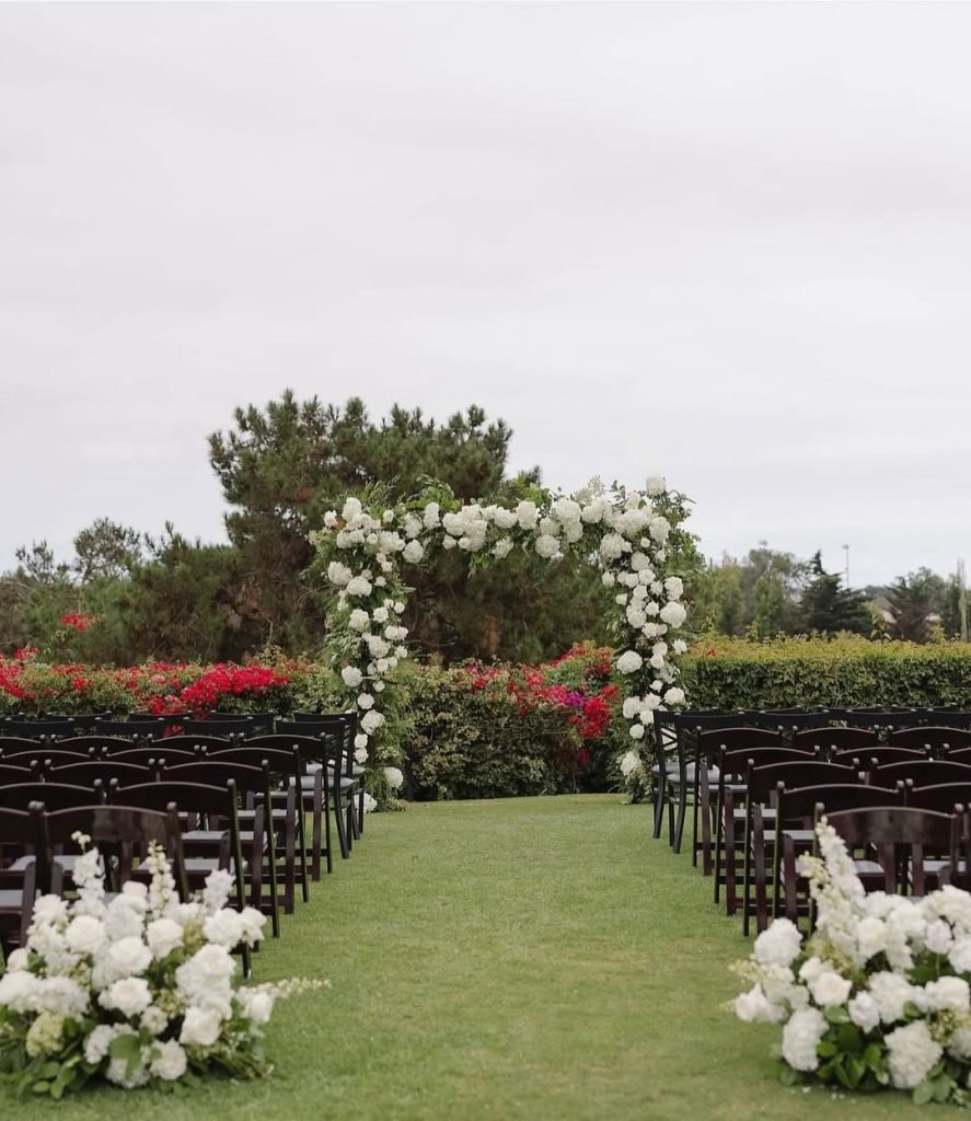 A lush arch of white hydrangeas floats like a cloud above the aisle, echoing the simplicity of the dark wooden chairs and manicured lawn. Clusters of ivory florals anchor the rows, balancing structure with softness and drawing the eye forward like a slow inhale.