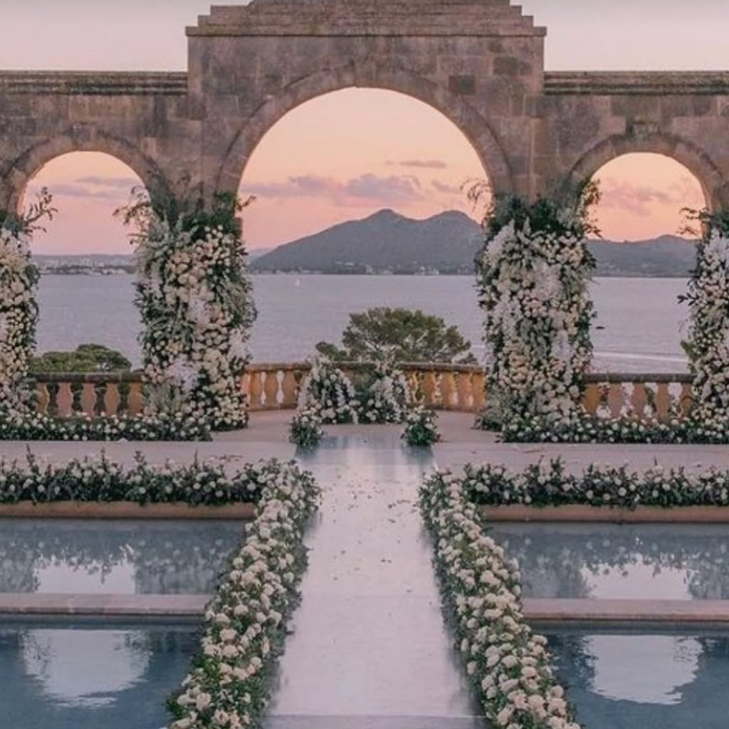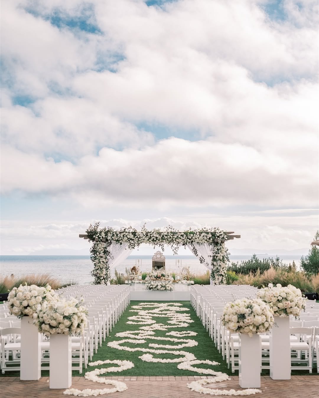 The aisle floats between twin pools, lined with hundreds of white roses that seem to bloom right out of the water. Towering floral pillars hug the arches, drawing your eye to the dusky horizon where sea meets sky in soft pastel layers. It’s the kind of view that doesn’t just complement the vows—it amplifies them.