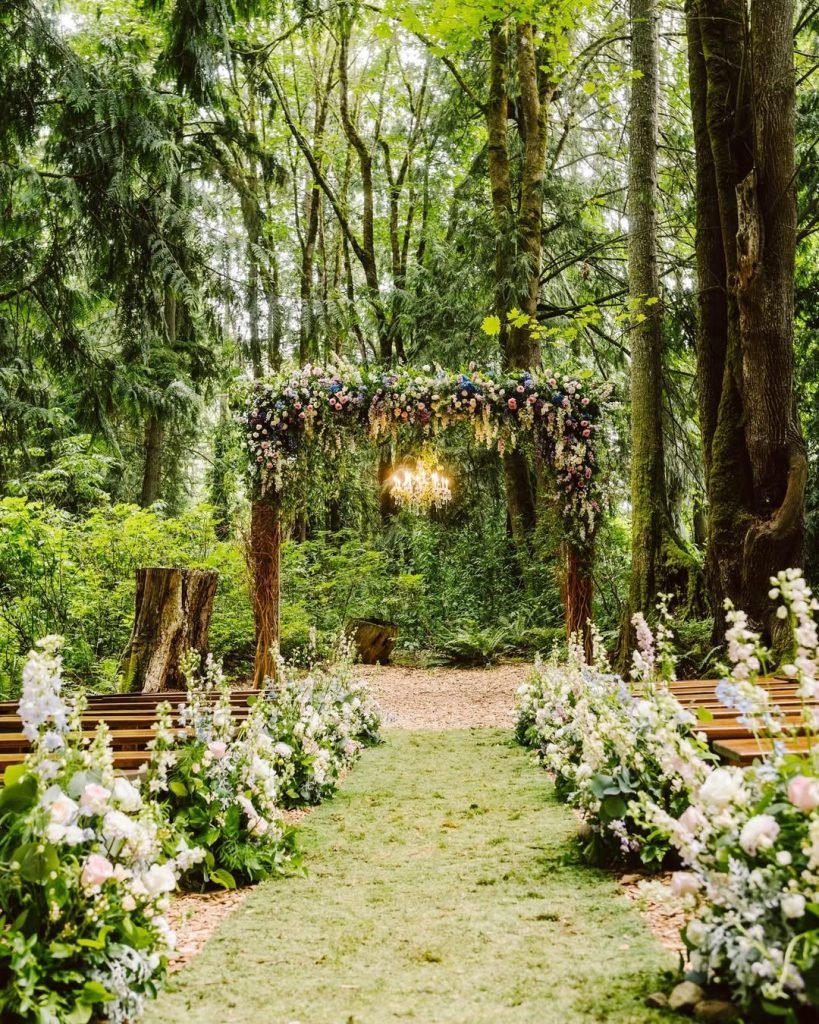 Blush and lavender blooms rise from moss-lined aisles, flanked by wooden benches and towering cedar trunks. The arch itself feels like it grew from the earth—twisting vines and flowers blooming in all directions, as if the woods themselves were celebrating.