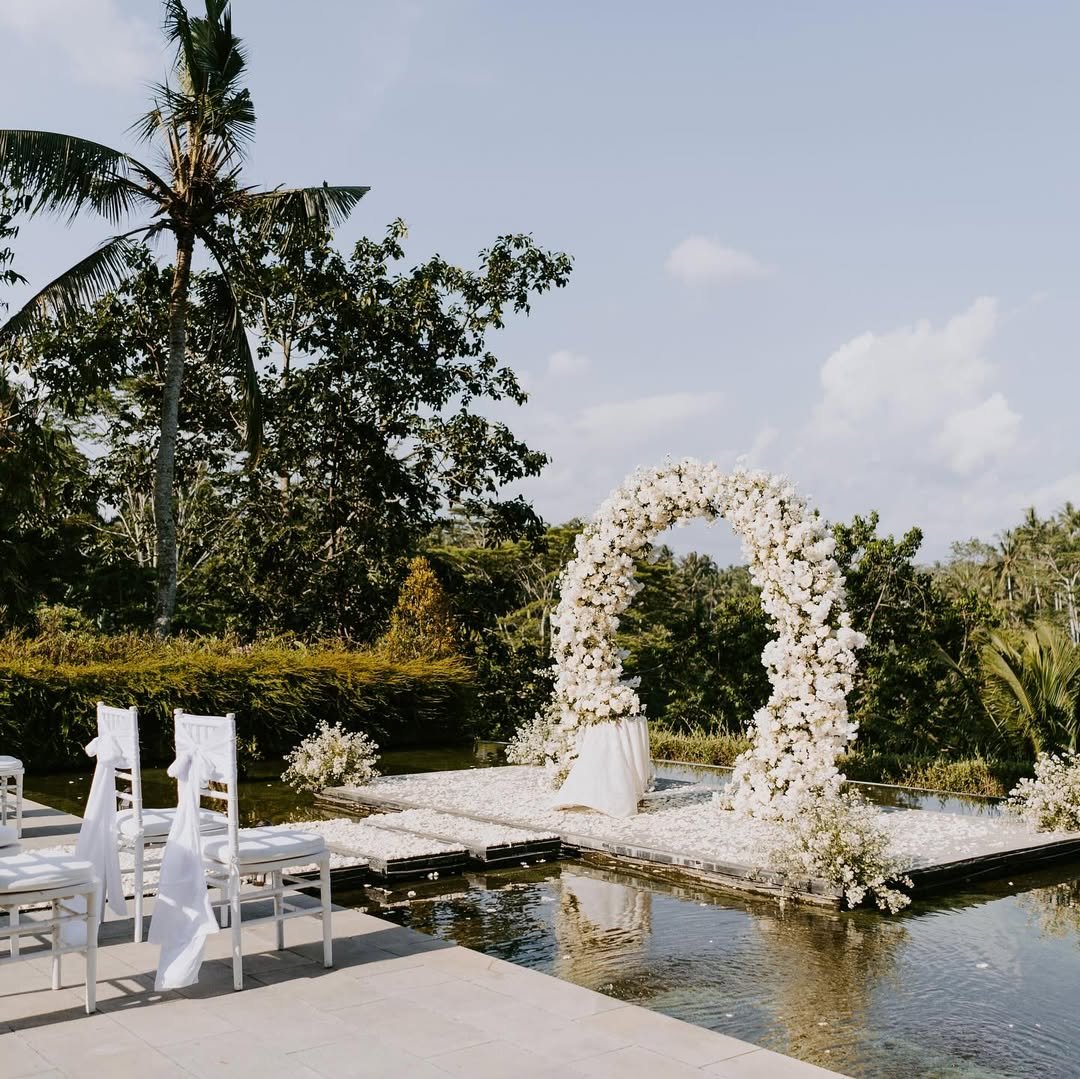 I’m still swooning over this floating floral altar framed by endless jungle greens. Bali Moon Wedding created a scene that felt like it belonged in a secret garden — petals drifting on the water, sunlight dancing off every ripple, and that impossibly lush backdrop wrapping everything in magic.