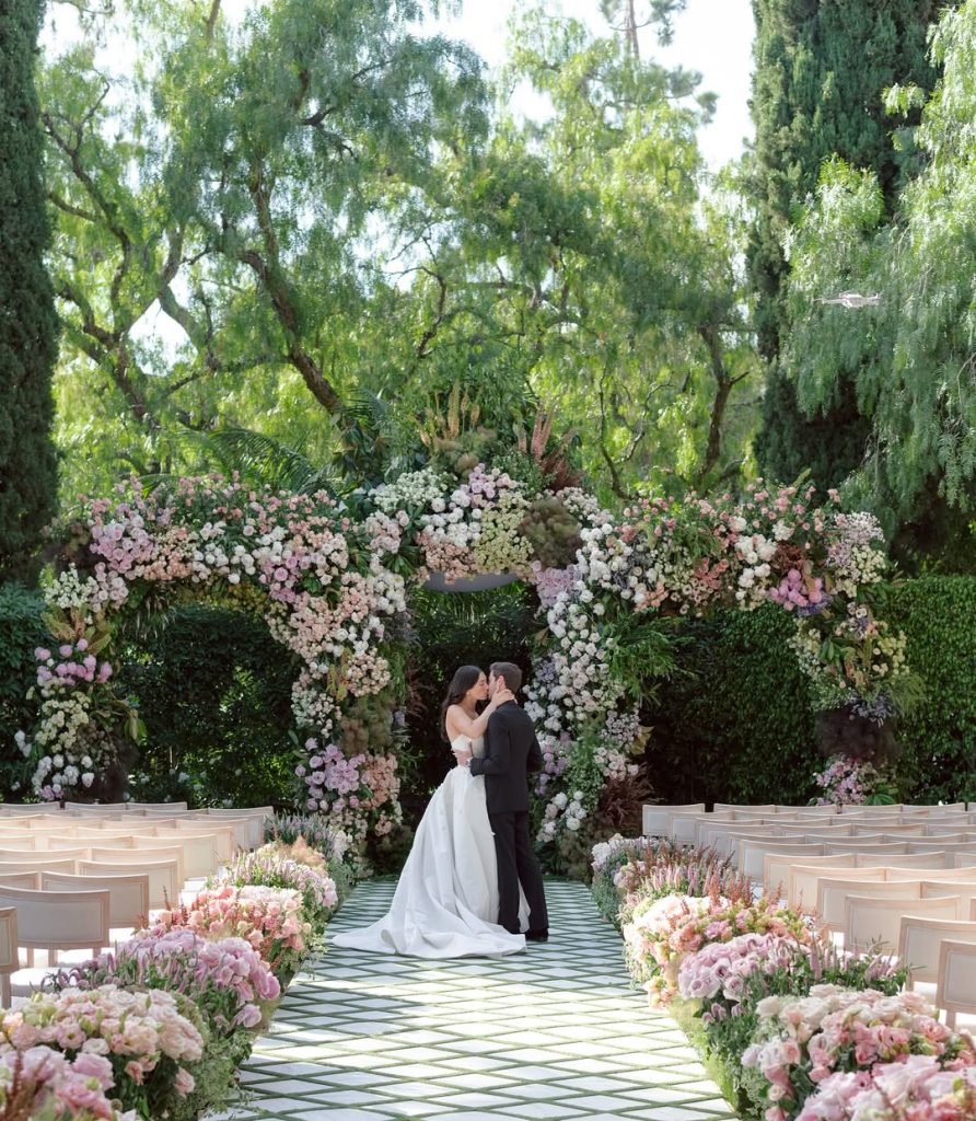 A lush floral canopy spills with ombré blooms—blush, mauve, and dusty violet—twining through sculptural arches that rise from manicured hedges like a secret garden in full crescendo. The checkerboard aisle, crisp and unexpected, brings a touch of modern edge beneath all the soft petals.