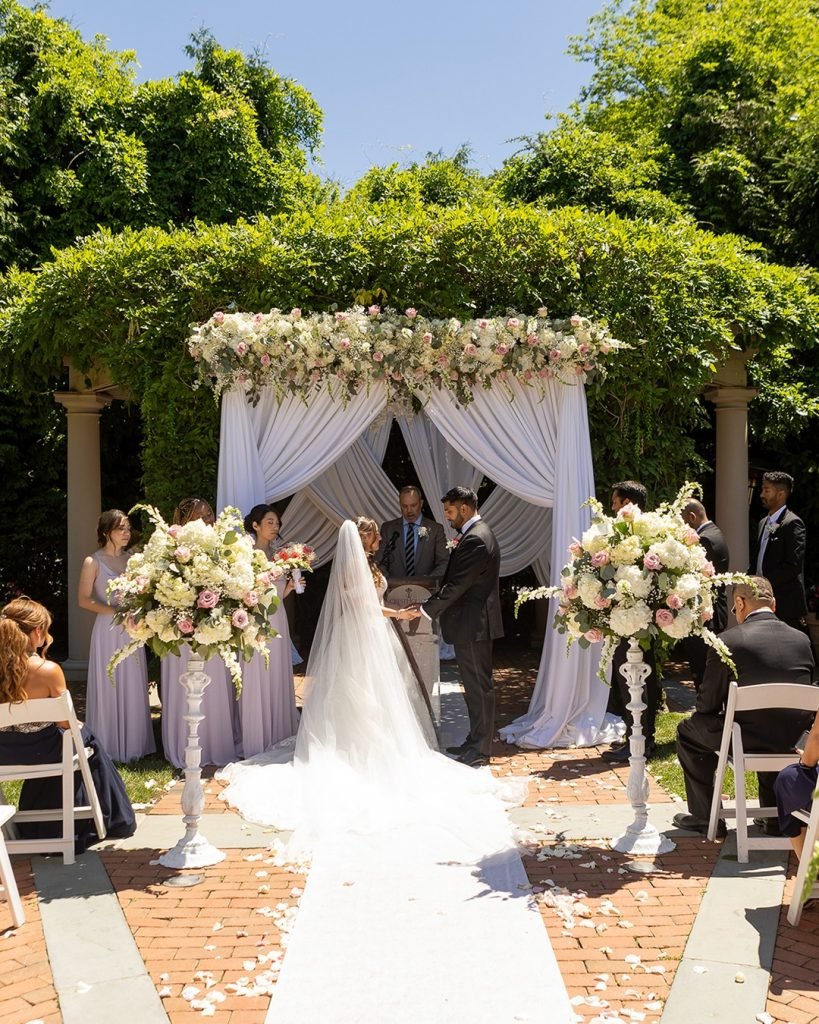 Billowing white drapes cascade from a pergola wrapped in fresh greenery, while blush and ivory roses spill over the top like frosting on a wedding cake. Twin urns of hydrangea and pale pink blooms line the aisle with quiet grandeur, setting a tone that’s classic without feeling stiff.