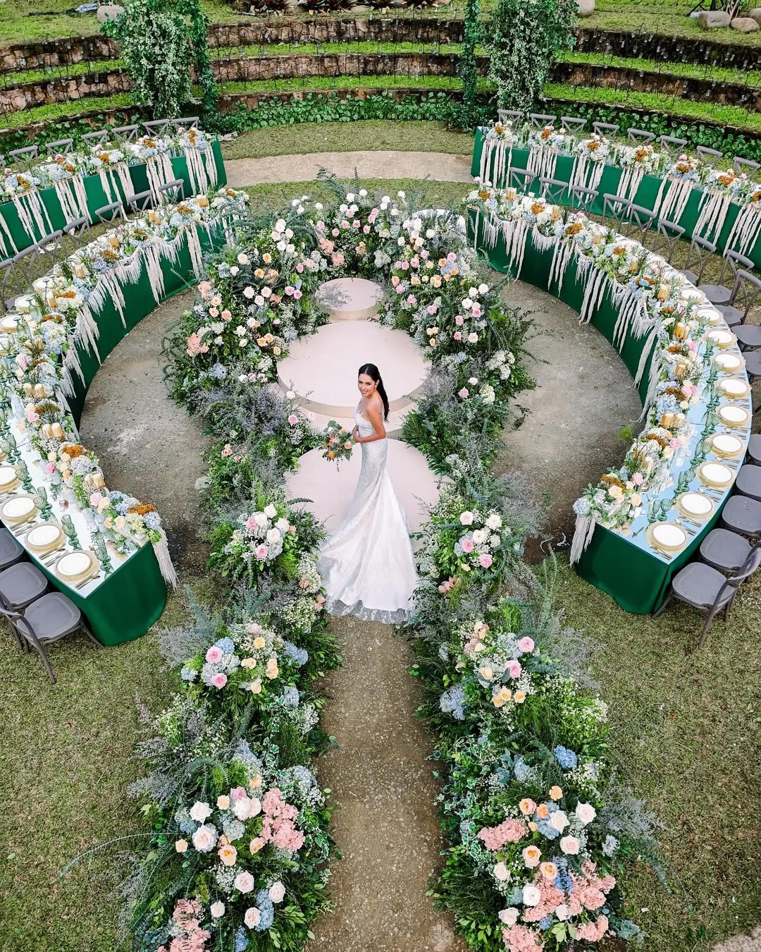 If I could bottle up the feeling of stepping into a real-life fairytale, it would look exactly like this. Lush blooms curling around every corner, emerald-green tables set under open skies — I’m fully swooning.