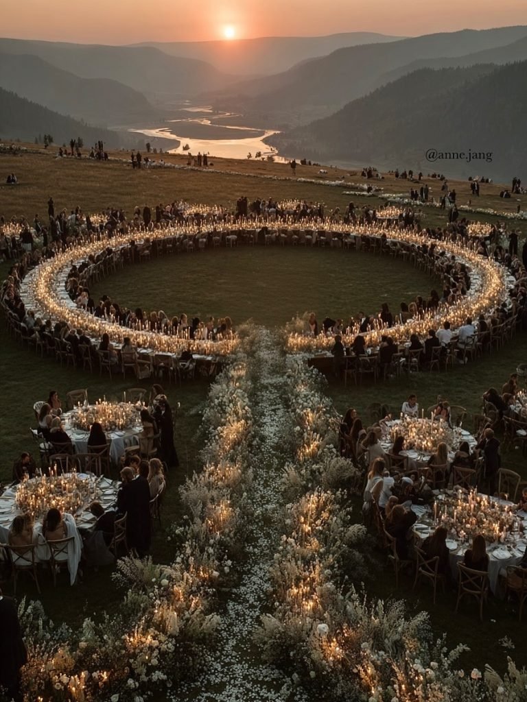 A perfect circle of candlelit tables creates a halo of light on the hillside, each flame dancing in rhythm with the fading sun. Wildflowers flank the aisle in soft, untamed waves—whispery white and golden, like they bloomed just for this moment.