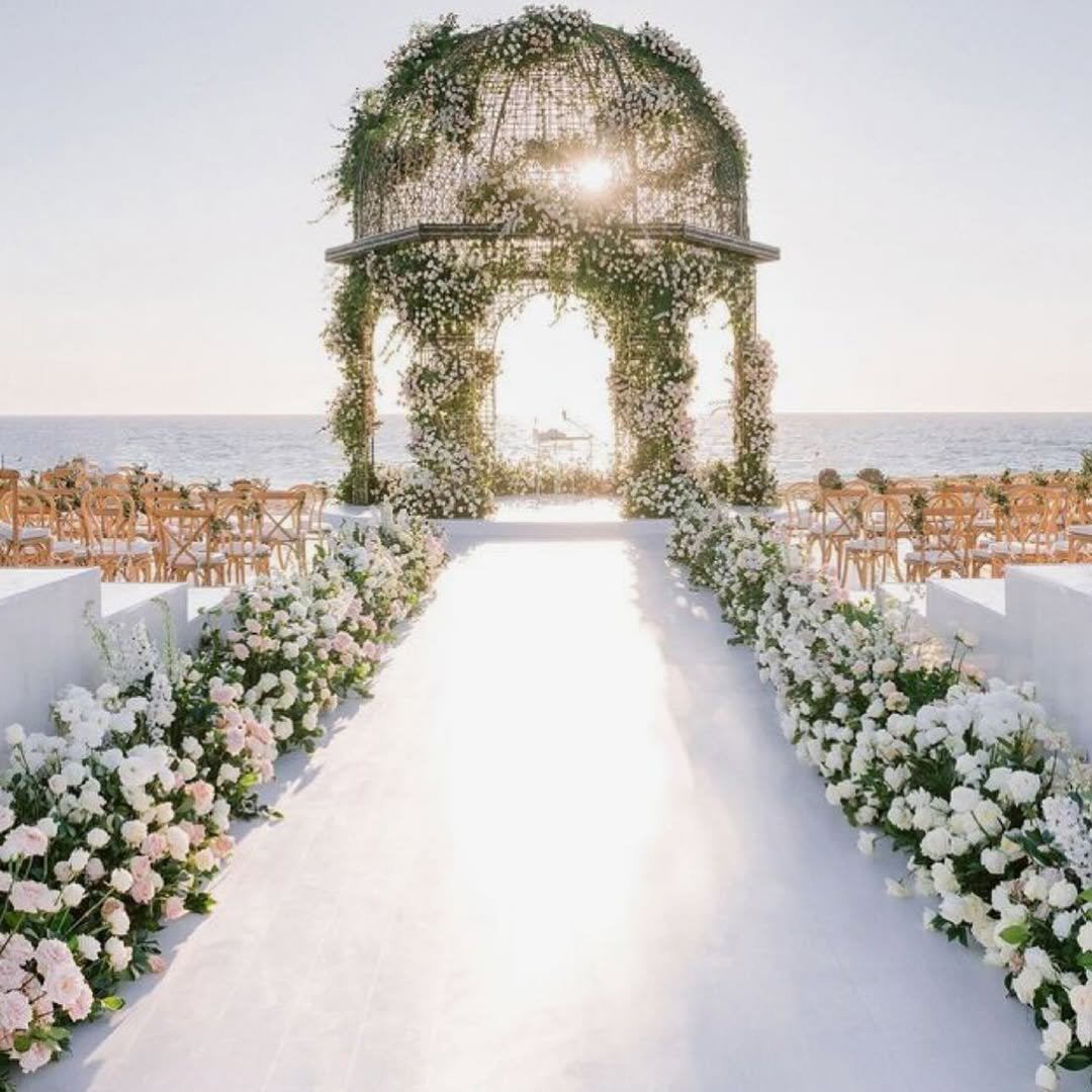 Stepping into this sun-drenched ceremony felt like wandering into a secret garden by the sea — the kind you only find in the best dreams. The dome, dripping in blush and ivory blooms, caught the last golden rays in the most magical way.