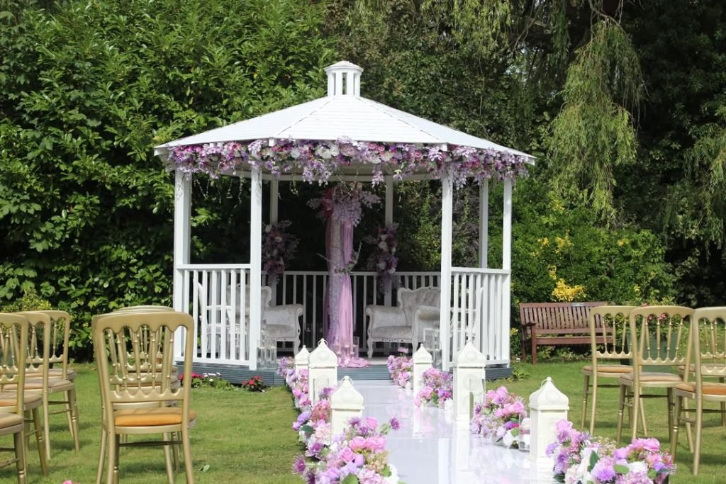 Gold chairs add just a touch of old-world glamour, while the surrounding greenery keeps everything grounded in the charm of a countryside garden.