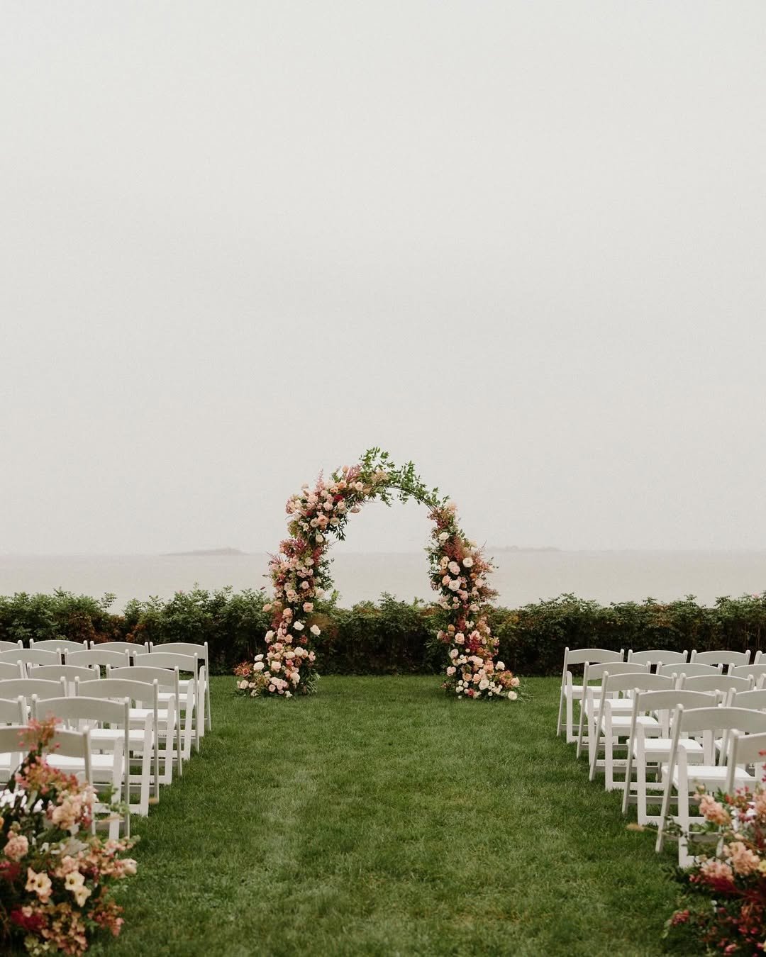 There’s something about a misty day and a wildly blooming floral arch that feels pure magic. I can practically hear the soft hum of nature all around — just a few chairs, the open sky, and the sweetest aisle lined with delicate blooms.