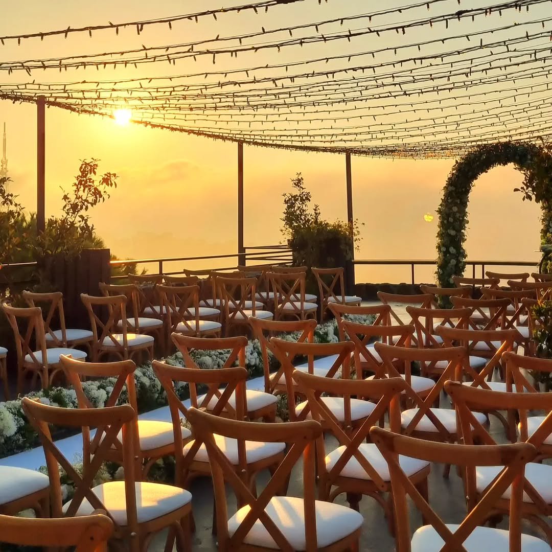 I can still feel the warmth just looking at this sunset ceremony at Villa Srour. Golden light spills over rustic wooden chairs and a canopy of twinkling lights, creating a setting that feels quietly magical and full of promise.
