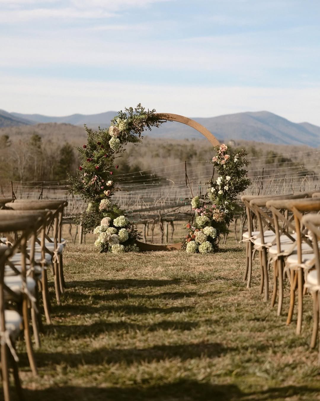 Standing here, wrapped in the soft hush of the mountains and that delicate golden light, felt like walking into a countryside fairytale. The asymmetrical arch from b.a.floral company, tangled with wild blooms and hydrangea clouds, made the scene feel effortlessly romantic — like nature itself was celebrating.