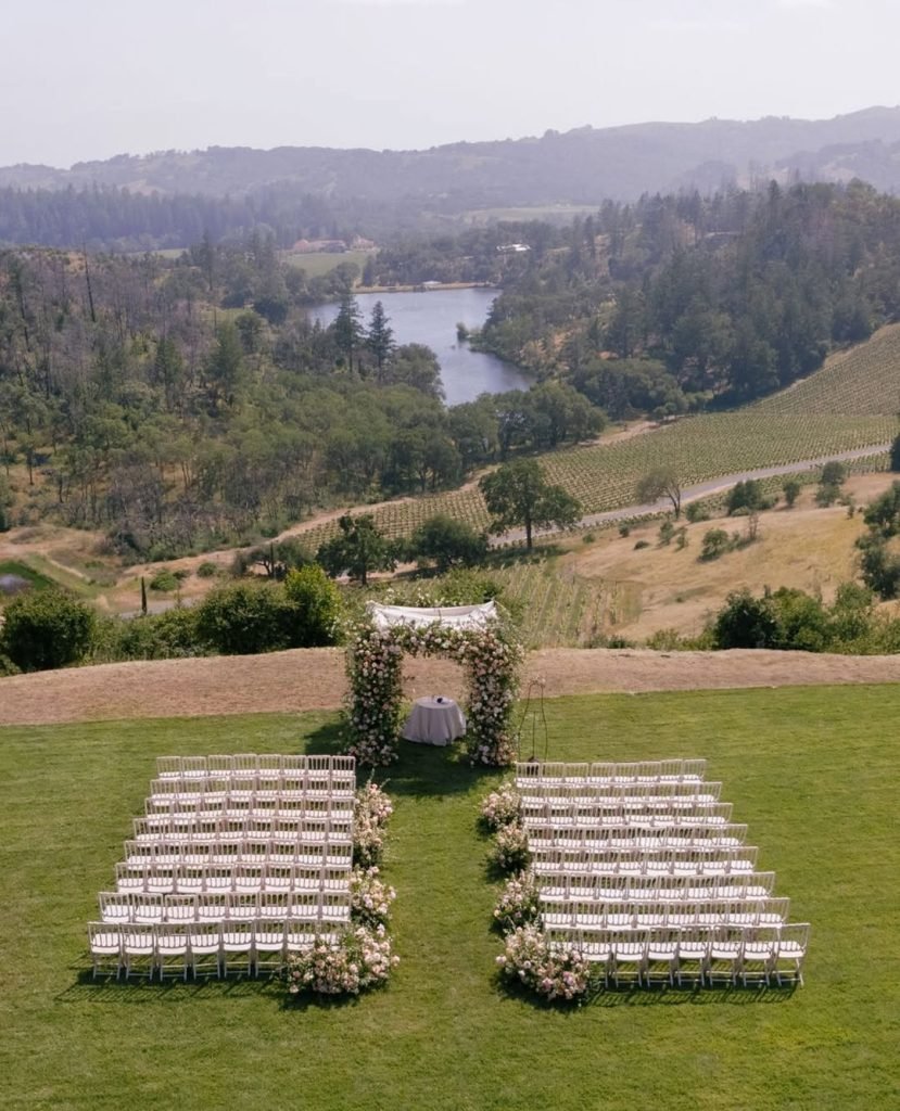 From above, the ceremony unfolds like a painting—verdant lawn giving way to golden hills and a river that seems to wind just for them.