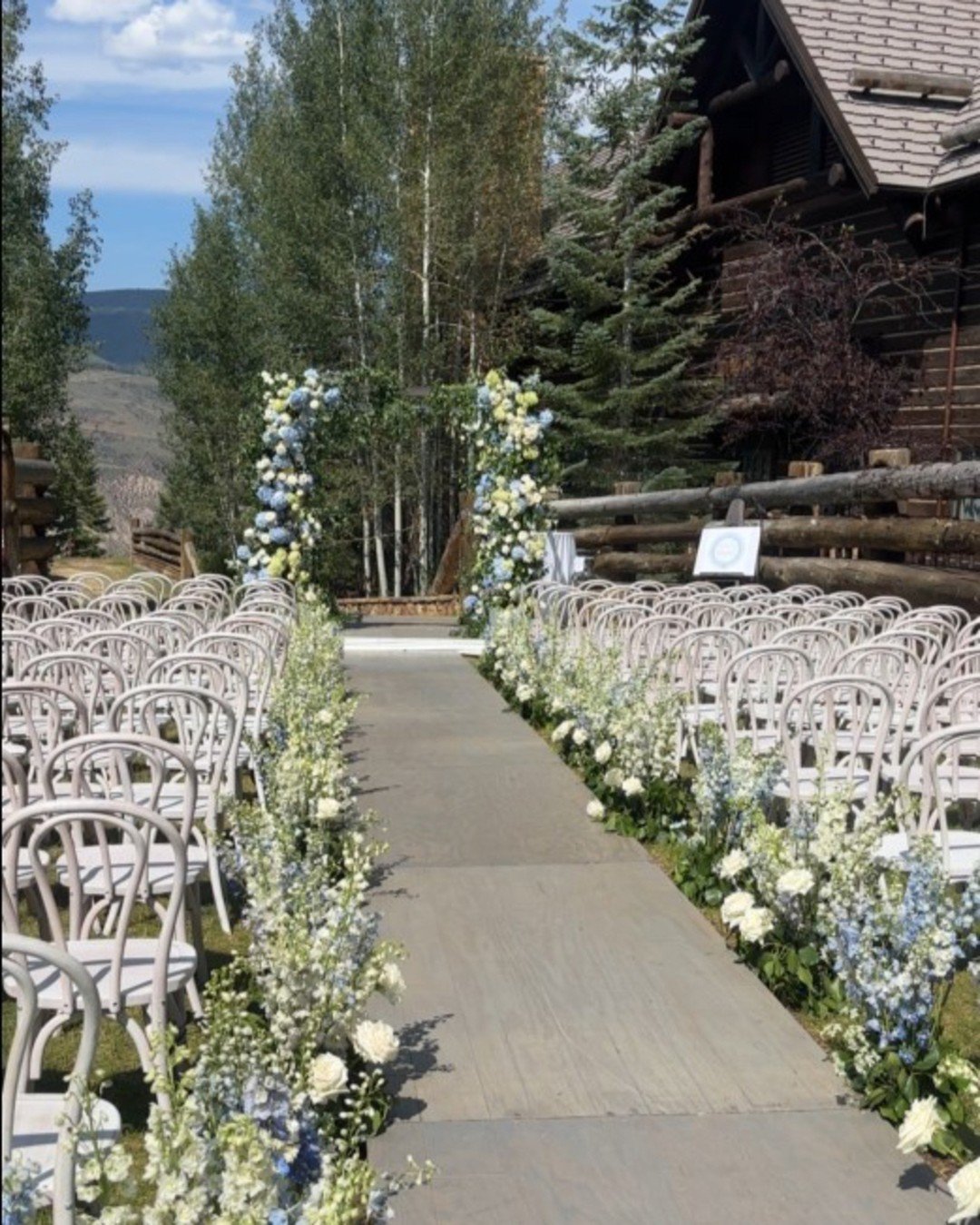 I’m completely smitten with this serene mountainside setup at the Ritz-Carlton, Bachelor Gulch. Pale blue and ivory blooms trail along the aisle like a soft breeze, while a hydrangea-drenched arbor frames the towering trees and distant peaks just perfectly.