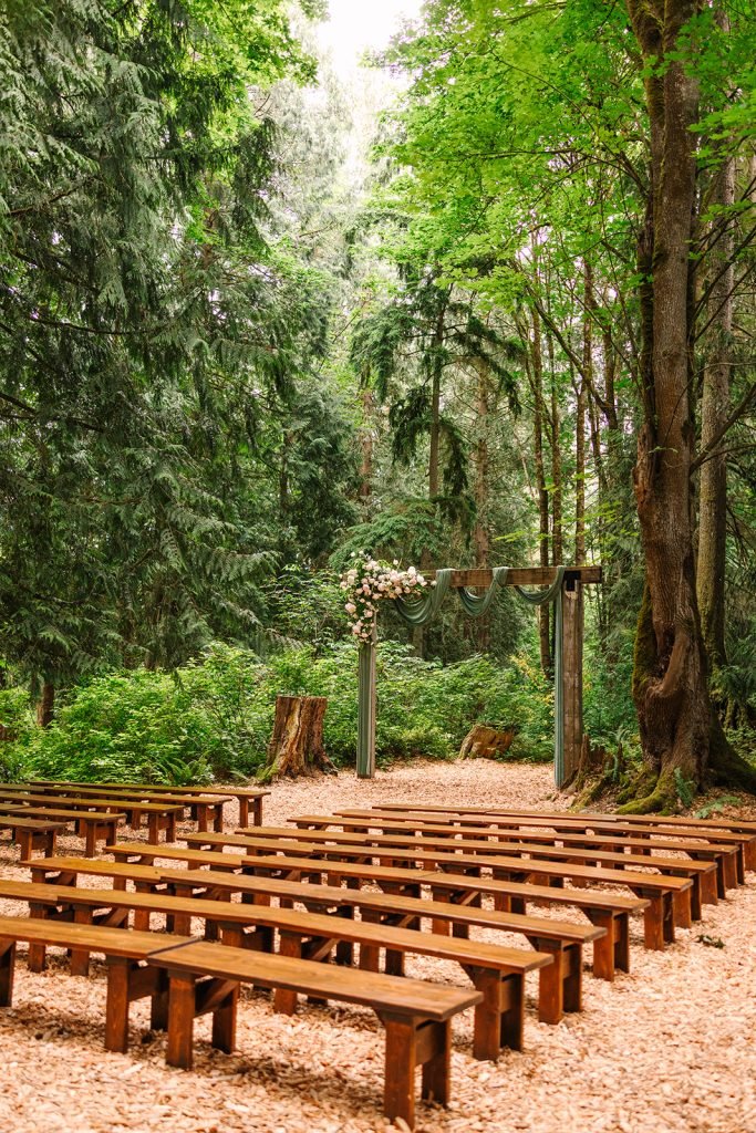 Rough-hewn benches line a woodchip path, their warm tone echoing the bark and earth below. A simple wooden arch, draped with sage green fabric and one delicate spray of blush florals, offers just enough softness to complement the setting without disturbing it.