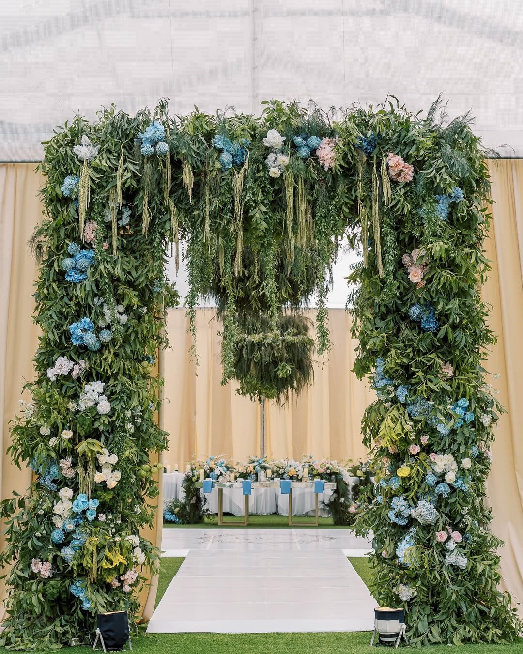 I stepped under this arch and genuinely paused—like, how is this real? It’s giving enchanted greenhouse meets modern Eden. With cascading greenery, touches of hydrangea blue, and that floating floral chandelier (!!), it felt like the whole ceremony bloomed around us in slow motion.