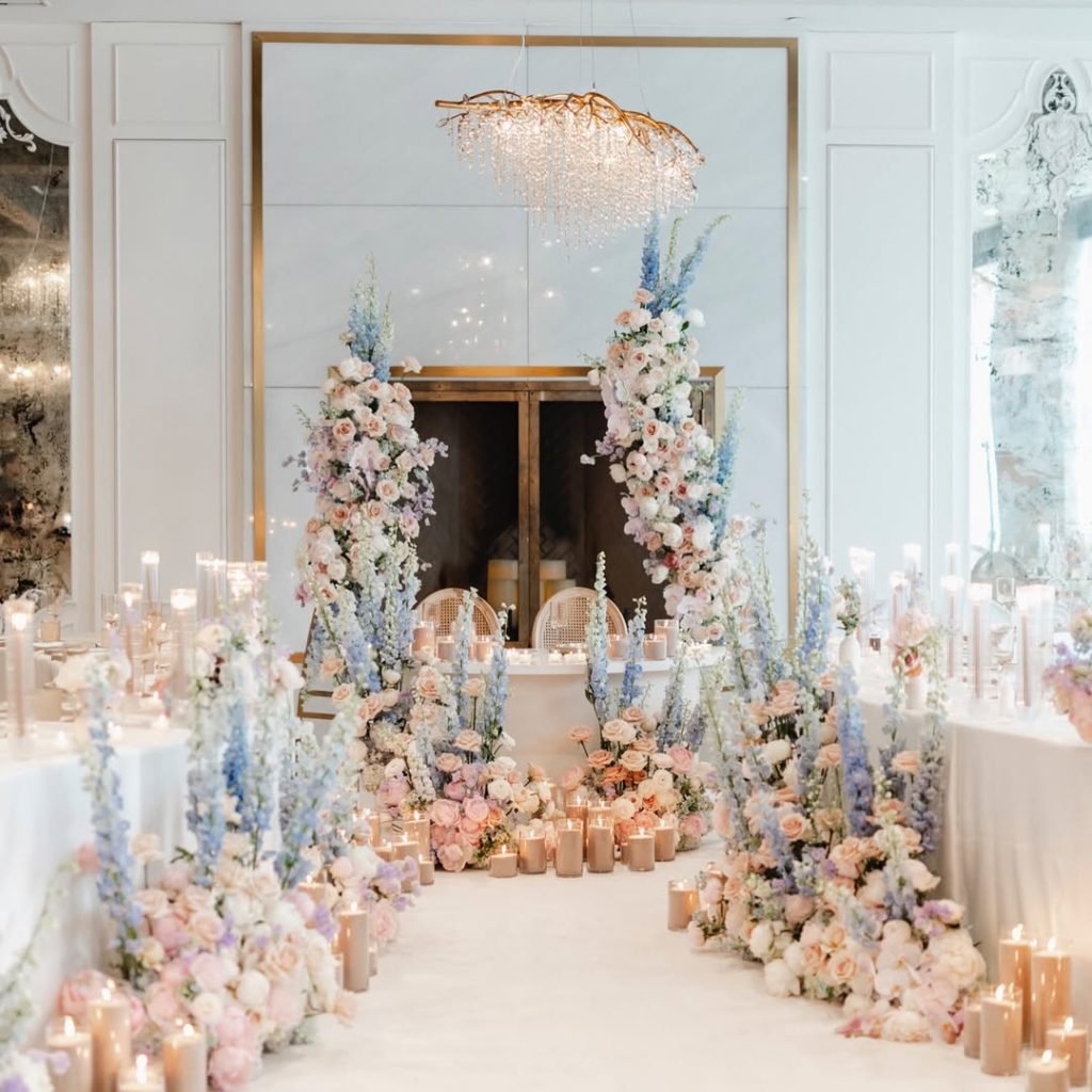 Where candlelight meets couture florals — this aisle feels like the opening scene of a modern fairytale. Blush, lilac, and powder-blue blooms spiral skyward in dreamy symmetry, softening the sleek white space with every petal.