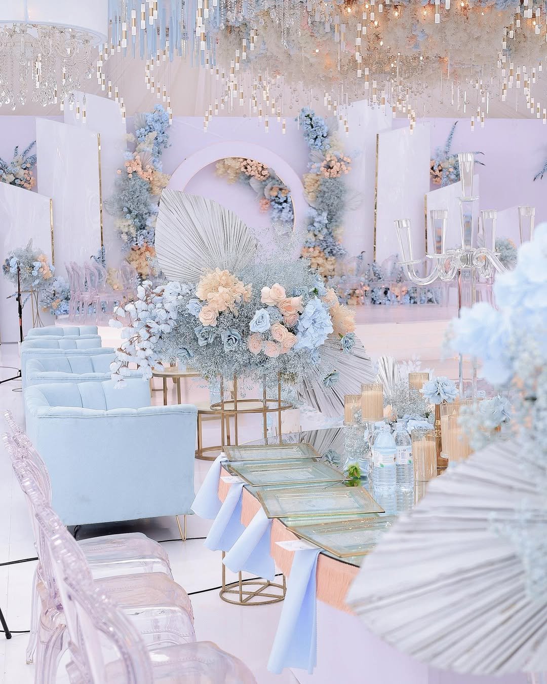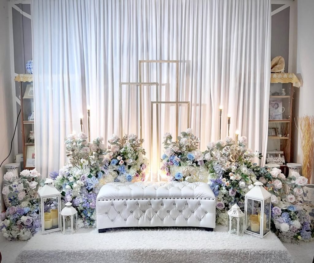 Like a quiet breath before the vows, this setup hums with calm sophistication. Draped in layers of soft white and accented by cool pastels — lavender, powder blue, and the faintest blush — the stage feels like a whisper of a garden blooming indoors.