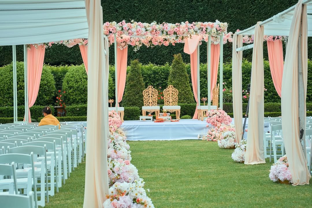 Walking down this aisle feels like floating into a floral fairytale—canopies of peach draping, bundles of blush blooms, and the softest palette that just melts into a summer day. I’m already picturing that soft breeze brushing through the curtains.