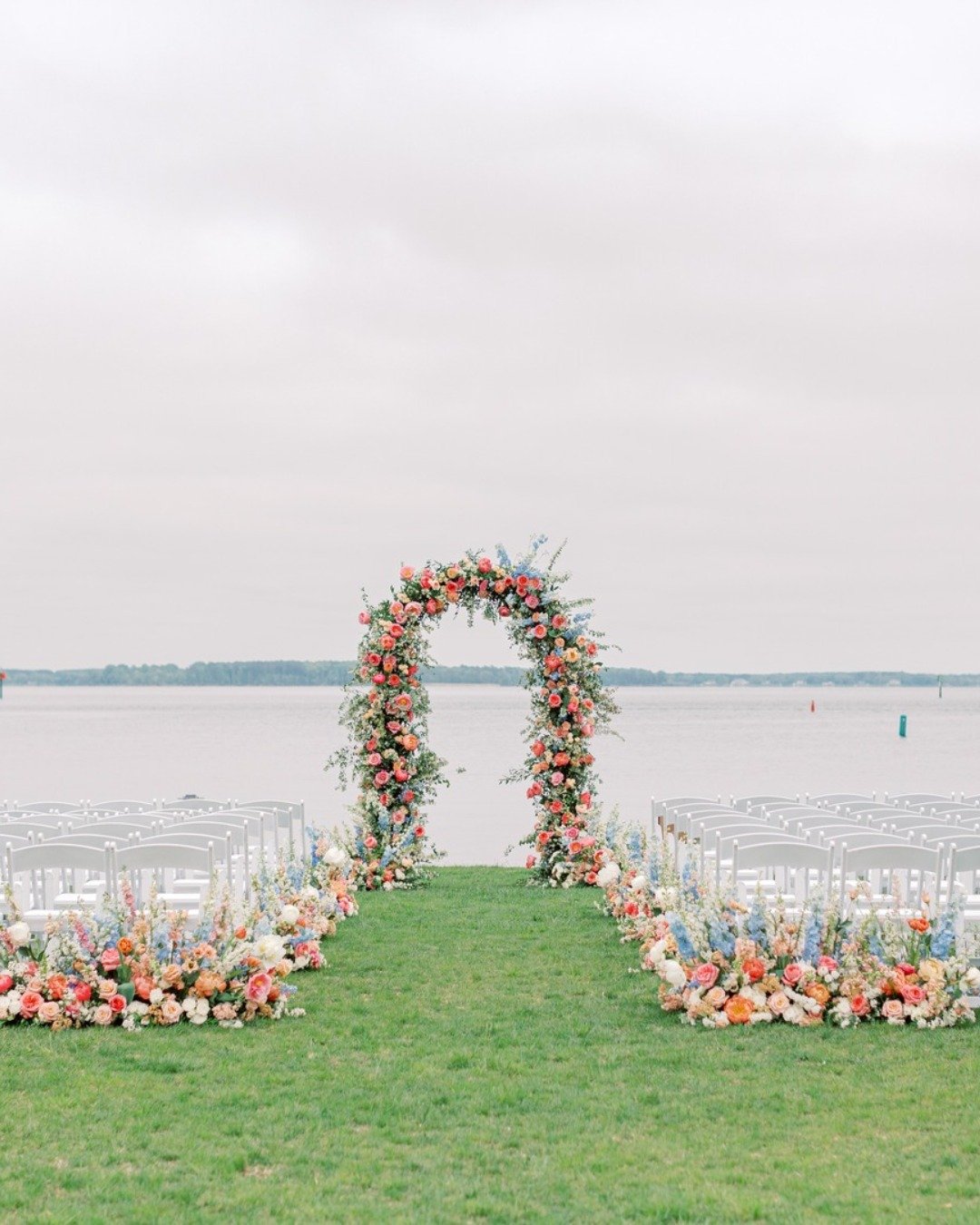 There’s a quiet magic in the simplicity here. No elaborate backdrop, just a perfect floral frame, the soft hush of waves, and all your favorite people facing the most romantic view.