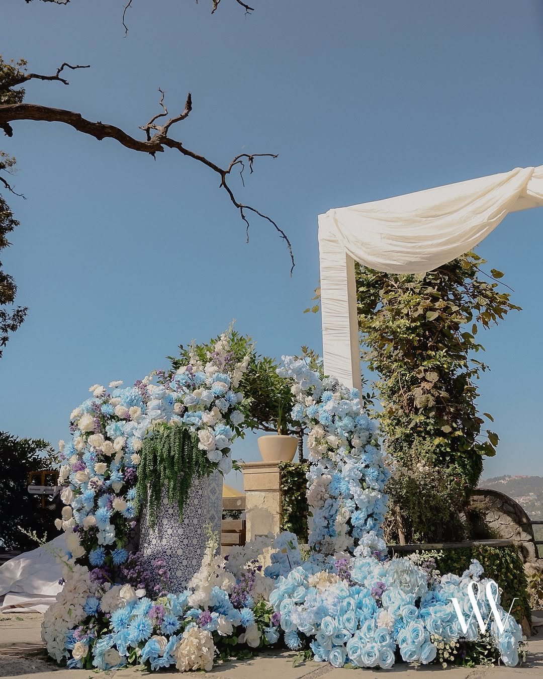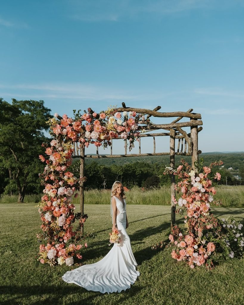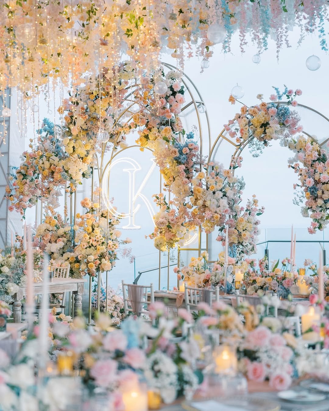 The florals bloom like they’re caught midair—peachy, pastel, and impossibly soft. It’s dreamy, architectural, and honestly, it feels like a ceremony on a cloud above the sea.