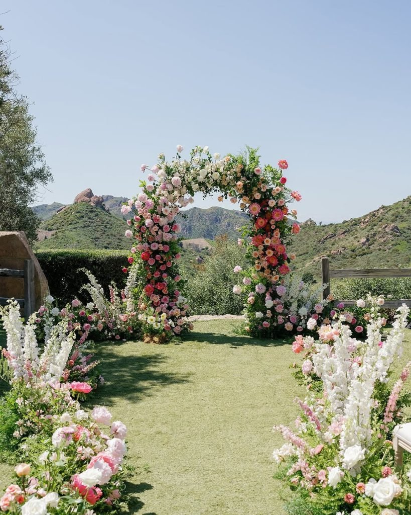 I mean, who wouldn’t want to say “I do” beneath a blooming pastel arch with the calm waters just beyond? This setup feels like a watercolor come to life—peachy roses, soft teal accents, and wild, trailing greenery that looks freshly plucked from a fairytale garden.