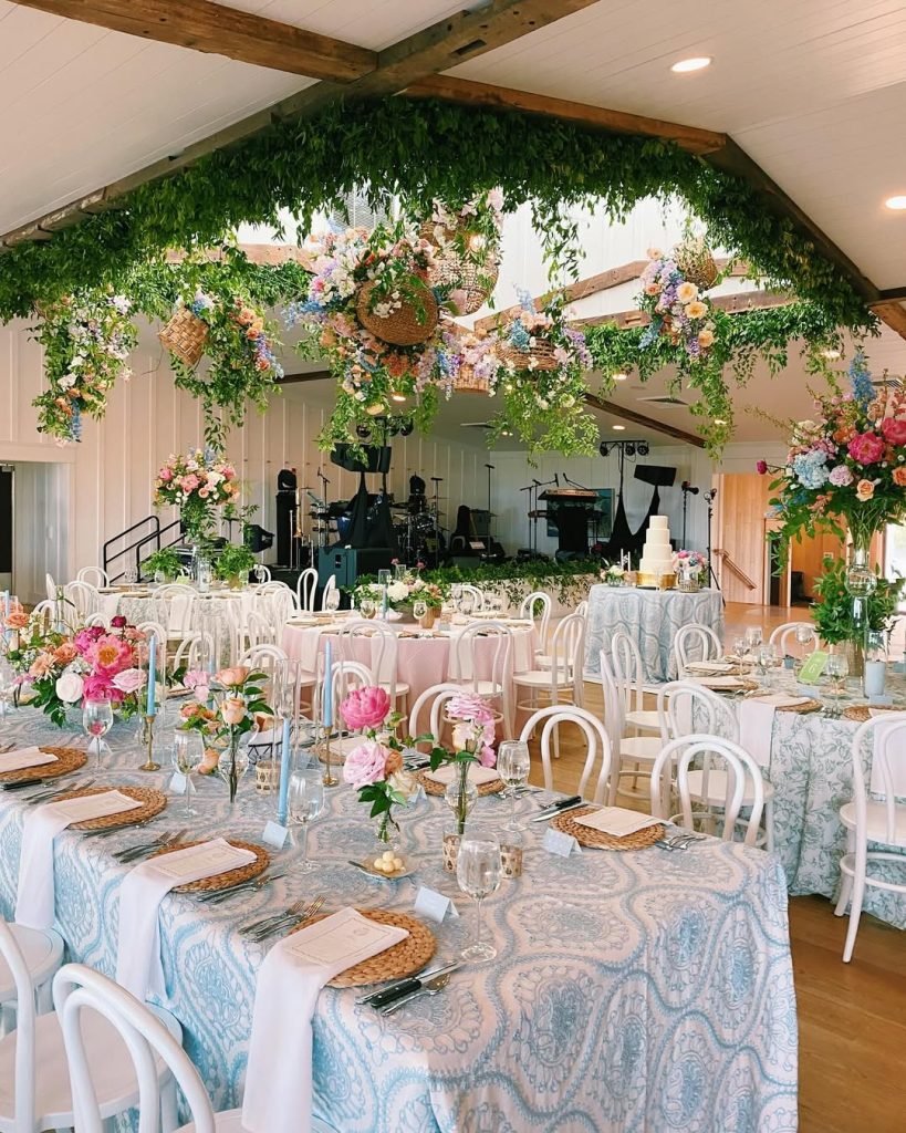This is what happens when fresh florals, French country linens, and Southern hospitality fall in love. Under a canopy of draped greenery and woven baskets bursting with blooms, each table feels like its own little garden. The patterned blue tablecloths add a soft elegance — a whisper of heirloom china or a summer porch set for tea.