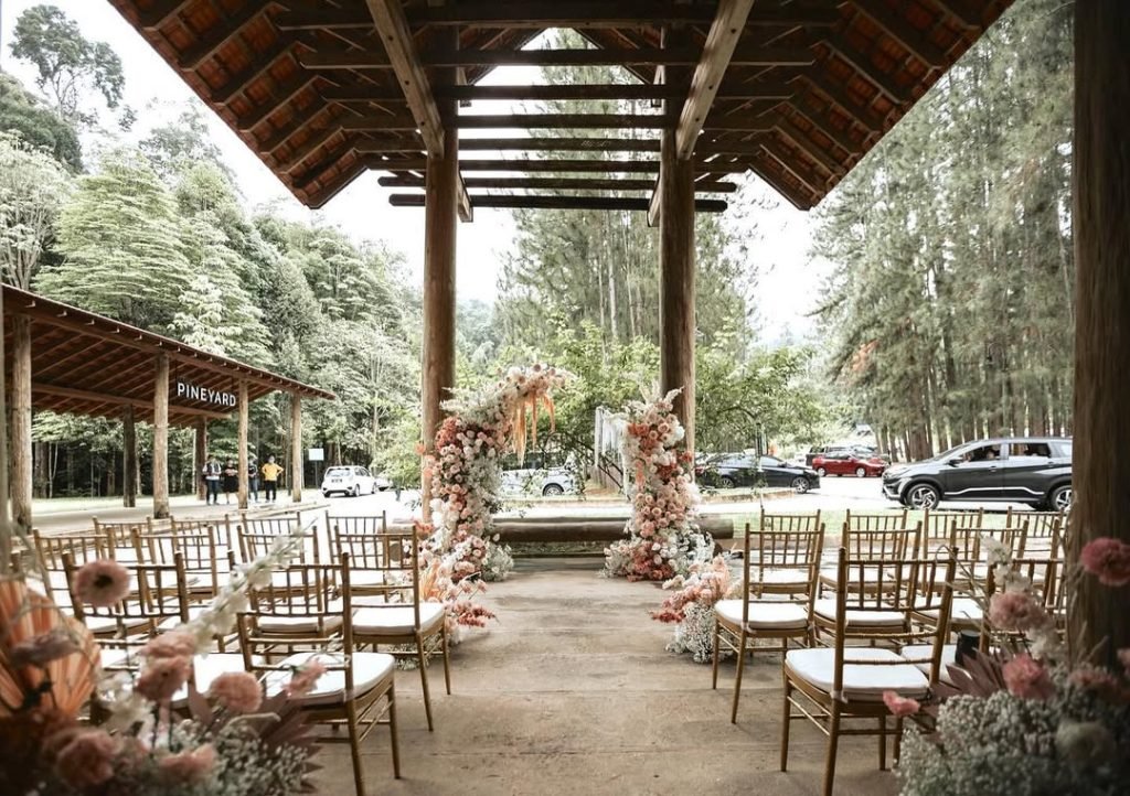 A soft hush falls over the forest as guests arrive — golden chairs aligned beneath timber beams, framing a moment that feels deeply grounded in nature yet touched by magic.
