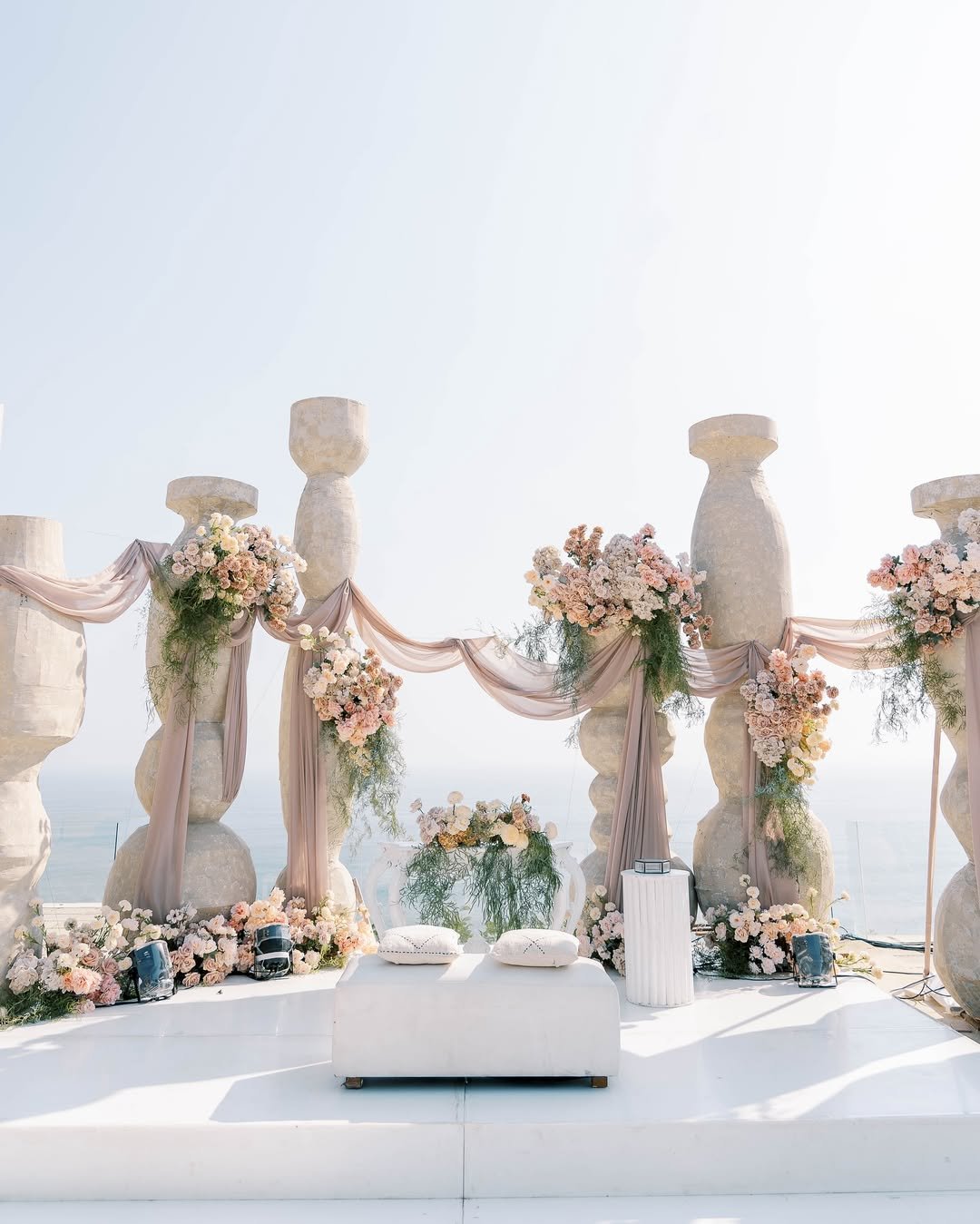 This altar made me stop in my tracks. The stone-like columns channel modern Grecian goddess energy, and that blush chiffon? It floats between them like wind turned to silk.