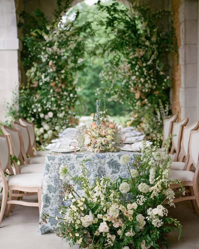 Tucked beneath arched stonework and framed by wild, tumbling greenery, this garden tablescape feels like something from a dream. A single table stretches elegantly beneath the shade, wrapped in a vintage-inspired blue and sage floral linen that whispers timeless charm.