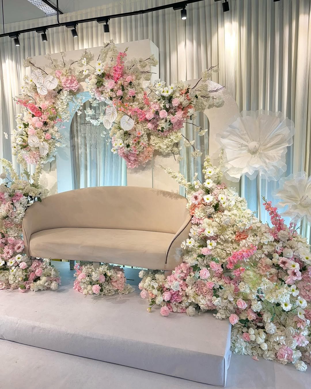 I could happily lounge on this stage forever—it’s like sitting inside a cloud spun from cotton candy and florals. Soft blush peonies and pale peach hydrangeas cascade like whipped frosting, and that cozy velvet settee just begs for a bridal portrait (or five).